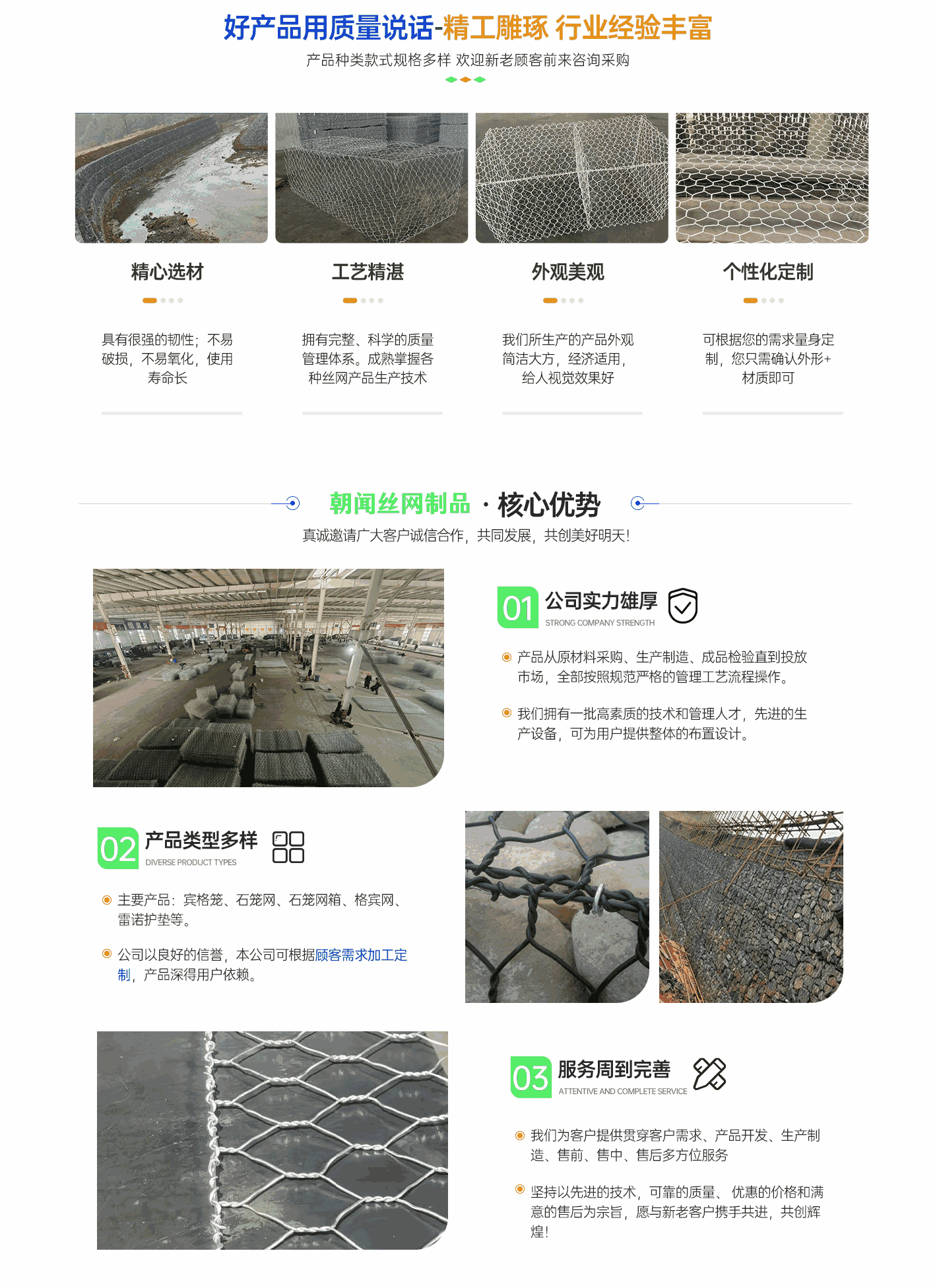 深州市朝聞絲網(wǎng)制品有限公司擁有“中國絲網(wǎng)之鄉(xiāng)”美譽的河北省致力于生產(chǎn)銷售格賓網(wǎng),雷諾護墊,景觀石籠網(wǎng),邊坡防護網(wǎng),綠濱墊,固濱籠的廠家,規(guī)格多種多樣?! ∥覐S堅持技術(shù)創(chuàng)新、科學管理、誠信經(jīng)營,注重引進新型生產(chǎn)技術(shù)設(shè)備,推行標準化生產(chǎn),采用質(zhì)量管理體系,從原材料采購、生產(chǎn)管理、產(chǎn)品檢測等關(guān)鍵環(huán)節(jié)嚴格把關(guān),確保了產(chǎn)品質(zhì)量,贏得了客戶的信賴。我公司秉承“誠信、務實、高效”的企業(yè)宗旨,真誠希望與世界各地客戶互惠互利,共創(chuàng)美好未來!多年來"以誠立廠","以質(zhì)興業(yè)"。 憑借過硬的質(zhì)量、良好的信譽、優(yōu)質(zhì)的服務、合理的價格不斷拓展市場,誠摯的希望在平等互利,坦誠相待的基礎(chǔ)上與國內(nèi)外客戶長期合作!...